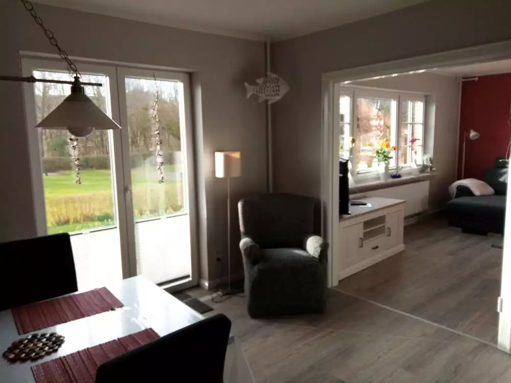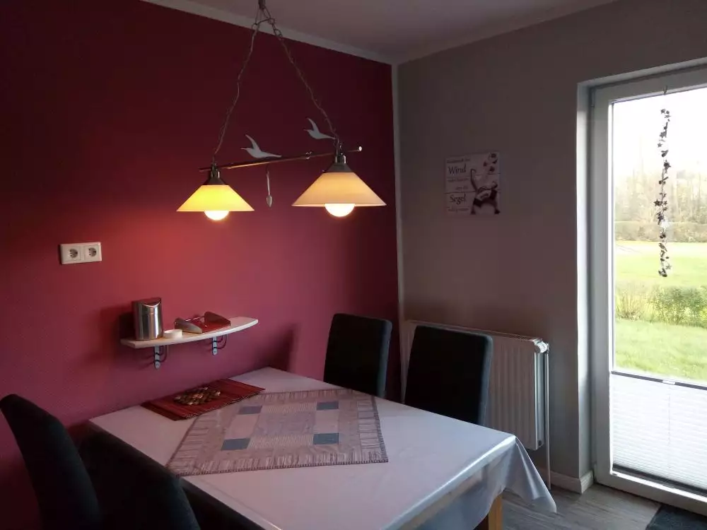 Das Esszimmer mit großem Esstisch und Radio schließt direkt an und führt über die Terrassentür auf die möblierte Südterrasse.