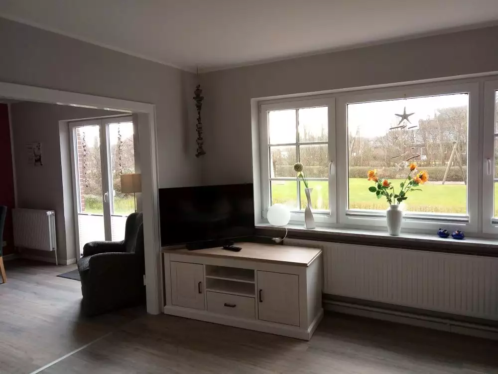 Im Erdgeschoss betreten Sie die Ferienwohnung über einen Flur mit Garderobe. Das geräumige Wohnzimmer ist gemütlich eingerichtet und bietet eine Couch, zwei Sessel sowie einen Flachbild-SAT-TV – ideal für entspannte Stunden.