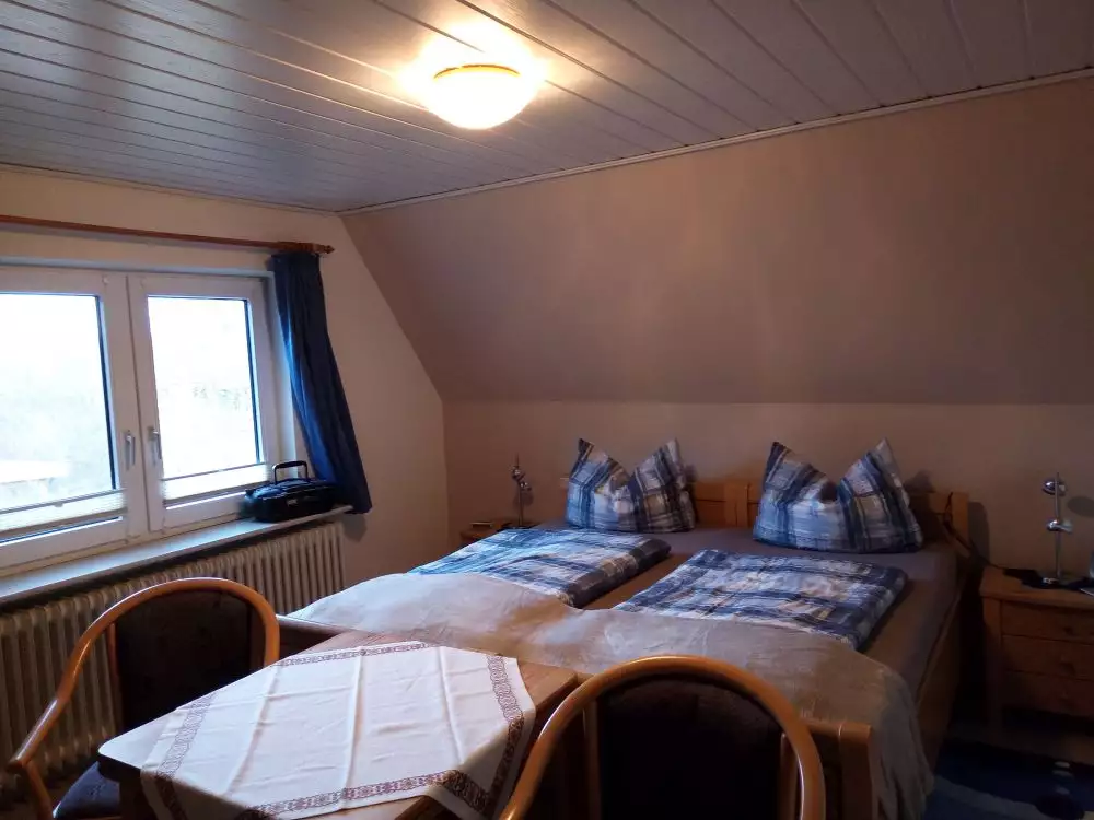 Im Obergeschoss befindet sich ein weiteres Schlafzimmer mit zwei Einzelbetten, die als Doppelbett gestellt sind. Ergänzt wird der Raum durch Tisch und Stühle sowie einen eigenen SAT-TV.